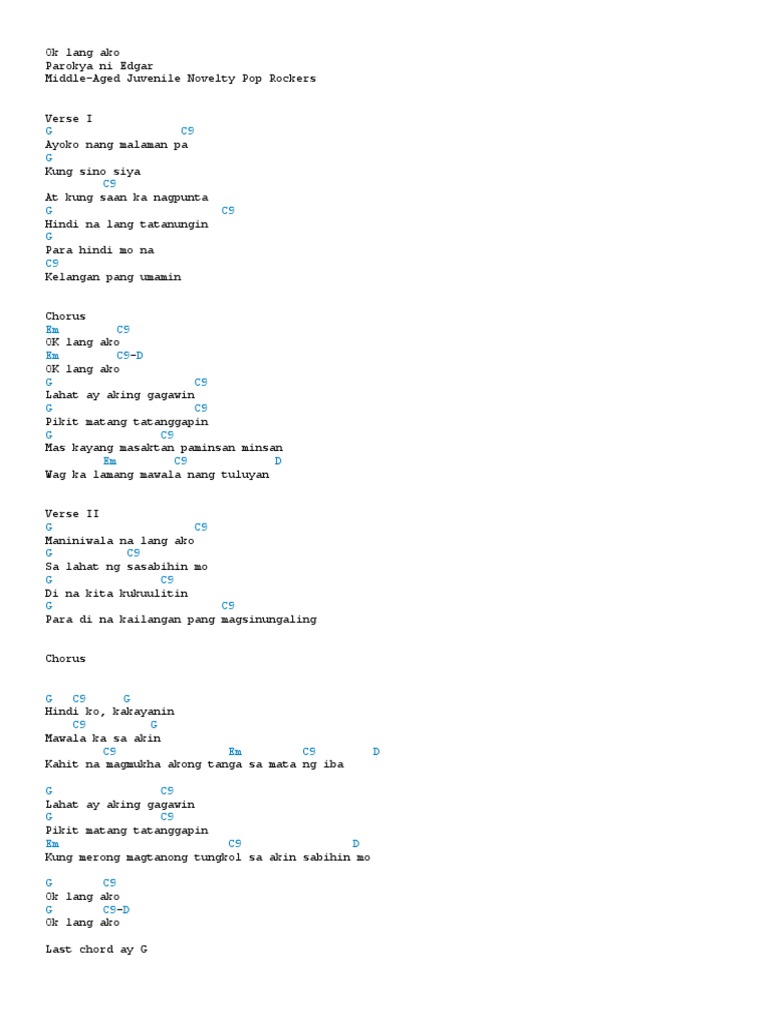 Chords for Parokya Ni Edgar - Ok lang ako. Chords for Parokya Ni Edgar - Ok lang ako. OK Lang Ako Parokya ni Edgar Middle-Aged Juvenile Novelty Pop Rockers Verse I GAyoko nang malaman C9pa GKung sino siya At kung C9saan ka nagpunta GHindi na lang tatanungin C9 GPara hindi mo na C9Kelangan pang umamin Chorus EmOK lang akC9o EmOK lang akC9-Do GLahat ay aking gagawiC9n GPikit matang tatanggaC9pin GMas kayang.