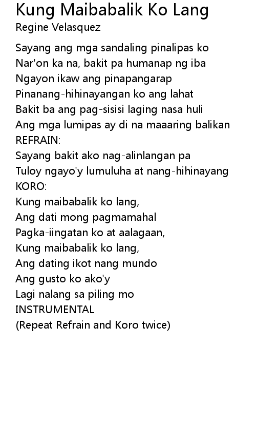Sayang ang mga sandaling pinalipas ko Naron ka na bakit pa humanap ng iba Ngayon ikaw ang pinapangarap Pinanang-hihinayangan ko ang lahat Bakit. 28032021 Sayang ang mga sandaling pinalipas ko Naron ka na bakit pa humanap ng iba Ngayon ikaw ang pinapangarap Pinanang-hihinayangan ko ang lahat Bakit ba ang pag-sisisi laging nasa huli Ang mga lumipas ay di na maaaring balikan Refrain Sayang bakit ako nag-alinlangan pa Tuloy ngayoy lumuluha at nang-hihinayang Koro Kung maibabalik ko lang. Kung maibabalik ko lang Ang dati mong pagmamahal Pagka-iingatan ko at aalagaan Kung maibabalik ko lang Ang dating ikot nang mundo Ang gusto ko akoy Lagi na lang sa piling mo.