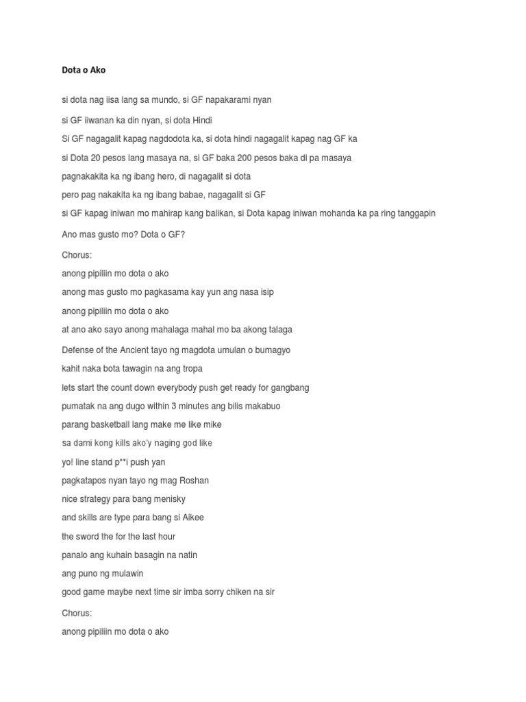 Choose one of the browsed Rap Dota O Ako Lyrics lyrics get the lyrics and watch the video. Si Dota isa lang sa mundo GF napakarami nyan Si GF iiwanan ka din nyan Si Dota hindi. Anong pipiliin mo dota o ako anong mas gusto mo kapag kasama yan ang nasa isip Anong mas g.