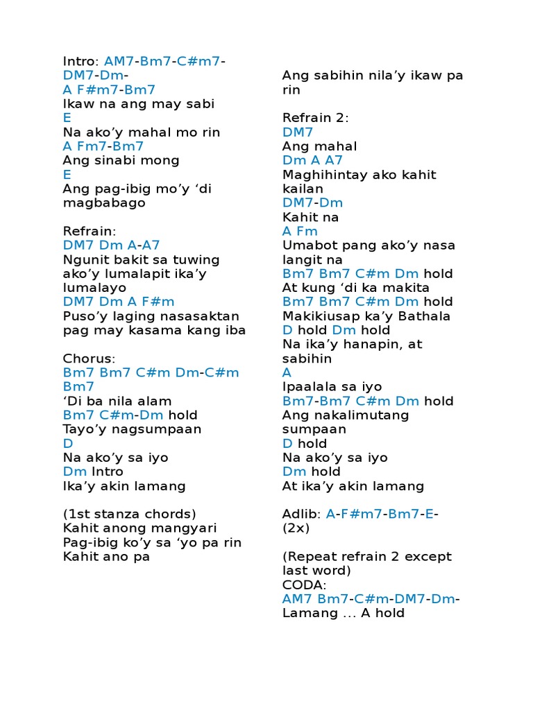 168544 views added to. IAxe Intro AM7 - Bm7 - Cm7 - DM7 - Dm A Fm7 - Bm7 Ikaw na ang may sabi E Na akoy mahal mo rin A Fm7 - Bm7 Ang sinabi mong E Ang pag-ibig moy di magbabago Refrain DM7 Dm A - A7 Ngunit bakit sa tuwing akoy lumalapit ikay lumalayo DM7 Dm A Fm Pusoy laging nasasaktan pag may kasama kang iba Chorus Bm7 Bm7 Cm Dm. Free printable and easy chords for song by Iaxe - Akoy Sayo At Ikay Akin Lamang.